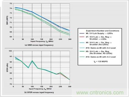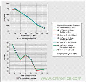 5 次實(shí)驗(yàn)的結(jié)構(gòu)變化配置如下: 實(shí)驗(yàn) 1—一個(gè) 5-V 實(shí)驗(yàn)室電源直接連接到 5-V 模擬輸入,同時(shí)繞過開關(guān)穩(wěn)壓器(TPS5420) 和低噪聲 LDO (TPS79501)。使用一個(gè)板上 LDO(TI 的 TPS79633)生成 ADS5483 低敏感度 3.3-V 模擬及數(shù)字電源的 3.3-V 電壓軌。