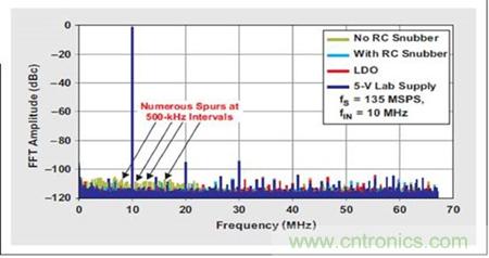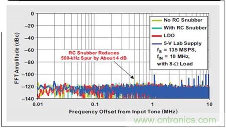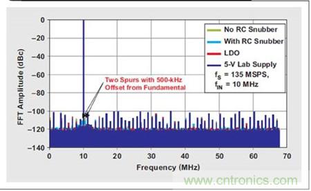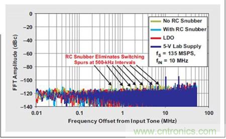 5 個(gè)實(shí)驗(yàn)的 FFT 曲線圖對(duì)比(請參見圖 6)顯示噪聲底限或雜散振幅沒有出現(xiàn) 較大的增加。使用 LDO 清除開關(guān)噪聲使得輸出頻譜看起來幾乎與干凈 5-V 實(shí) 驗(yàn)室電源完全一樣。去除 LDO 以后,我們觀測到從開關(guān)穩(wěn)壓器產(chǎn)生了兩個(gè)雜散, 其具有一個(gè)來自 10-MHz 輸入音調(diào)的約 500 kHz 頻率偏置。RC 緩沖器電路降 低這些雜散振幅 約 3dB,從約 –108 dBc 降到了約 –111 dBc。這一值低于 ADS5483 的平均雜散振幅,其表明 ADS5483 可以在不犧牲 SNR 或 SFDR 性 能的情況下直接由一個(gè)開關(guān)穩(wěn)壓器來驅(qū)動(dòng)。