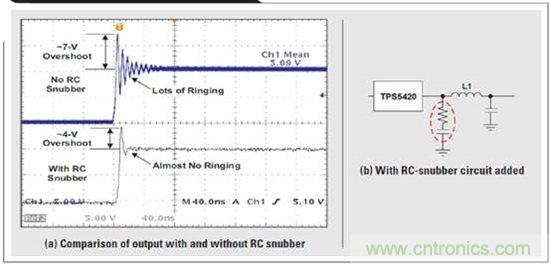 RC 緩沖器 降壓穩(wěn)壓器輸出能夠以相當(dāng)高的開關(guān)速度對(duì)非常大的電壓實(shí)施開關(guān)操作。本文 中,將 TPS5420 的輸入電壓軌設(shè)定為 10V,我們可以在輸出端觀測到許多過沖 和振鈴,如圖 7a 所示。為了吸收一些電源電路電抗能量,我們將 RC 緩沖電 路添加到了 TPS5420 的輸出(請參見圖 7b)。