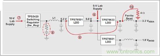 實(shí)驗(yàn) 6—將一個(gè) 5-V 實(shí)驗(yàn)室電源連接到兩個(gè)低噪聲 LDO(一個(gè)使用 3.3-V 輸 出,另一個(gè)使用 1.8-V 輸出)的輸入。LDO 并未給實(shí)驗(yàn)室電源帶來任何有影響 的噪聲。實(shí)驗(yàn) 7—將一個(gè) 10-V 實(shí)驗(yàn)室電源連 接到 TPS5420 降壓穩(wěn)壓器,其與 一個(gè)5.3-V 輸出連接,像“實(shí)驗(yàn) 2”連接 ADS5483 一樣。TPS79501 生成了一個(gè)過濾后的 5.0-V 電壓軌,其向 3.3-V 輸出和 1.8-V 輸出 LDO 提供輸入,如圖 10所示。 實(shí)驗(yàn) 8—所有 3.3-VVDDA 電壓軌 LDO 均被繞過。TPS5420 配置為一個(gè) 3.3-V 輸出,該輸出直接連接到 3.3-VVDDA 電壓軌。TPS79601 生成 1.8-VDVDD 電壓軌, 并通過一個(gè)外部 5-V 實(shí)驗(yàn)室電源供電。