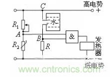 許多家庭都安裝了電熱水器,它給人們的生活帶來了方便。如圖所示是電熱水器系統(tǒng)的恒溫器集成電路。R1為調(diào)溫電阻,R2為熱敏電阻。“與”門電路的兩個輸入端分別接上一個水位傳感器和一個水溫傳感器。當水箱充滿水時,B點為高電壓(即輸入為邏輯1),R2為熱敏電阻,溫度越低,熱敏電阻的阻值越大,兩端的分壓越大,當電壓達到一定程度時,A點為高電壓(即輸入為邏輯1),當A和B都為高電壓時,“與”門的輸出端為高電壓,電熱水器的加熱開關(guān)才會接通電源,對水箱中的水進行加熱。當溫度高于一定溫度時,R2的電阻變小,R2兩端的電壓變小,發(fā)熱器停止加熱,所以熱水器處于保溫狀態(tài)。當水箱水不滿時,或者溫度高時發(fā)熱器都不會加熱。