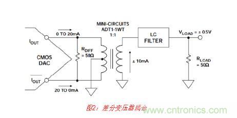 變壓器不僅用于將差分輸出轉換成單端信號,而且還將DAC的輸出與LC濾波器的抗性負 載隔離開來,因而可以改善整體失真性能。