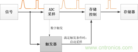 這就要靠觸發系統來實現。觸發的原理是一直監控信號流,若發現信號滿足設定的觸發條件,觸發器記錄滿足條件的信號,啟動采樣;待數據采集完畢后,由控制器對信號進行處理和顯示。具體如圖2所示。