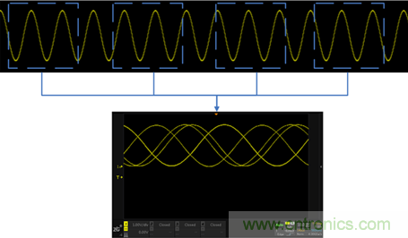 示波器的觸發條件的一個很關鍵的因素是觸發電平,觸發電平大多數情況下是用一根直流電平作為基準,當信號的電壓超過該直流電平的時刻作為采樣波形的起始點。由于起始采樣的位置是有規律的,因此多次采樣的波形進行疊加后看上去還是一個穩定的波形。如圖3所示: