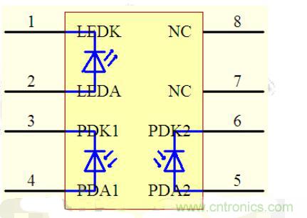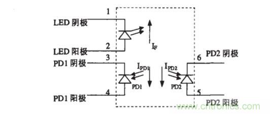 HCNR200/201包括一只高性能的發光二極管(圖中的LED),兩只極其相似的光電二極管(圖中的PD1和PD2)。當LED中流過電流If時。其發出的光會在PD1和PD2中感應出正比于LED發光強度的光電流Ipd1和Ipd2。由于PD1和PD2的特性非常相似,再加上安裝位置的精確性以及元件先進的封轉設計保證了該元件的高線性度和增益的穩定性。