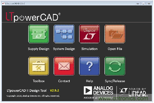 LTpowerCAD可用來為各個電壓軌提供電源解決方案。它還提供一系列參考設計,以讓設計人員快速入門。LTpowerCAD可以從ADI公司網站免費下載。