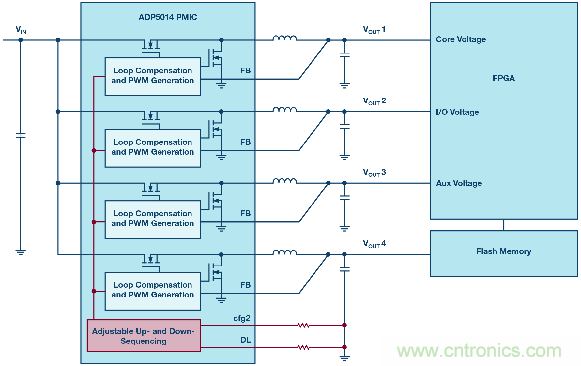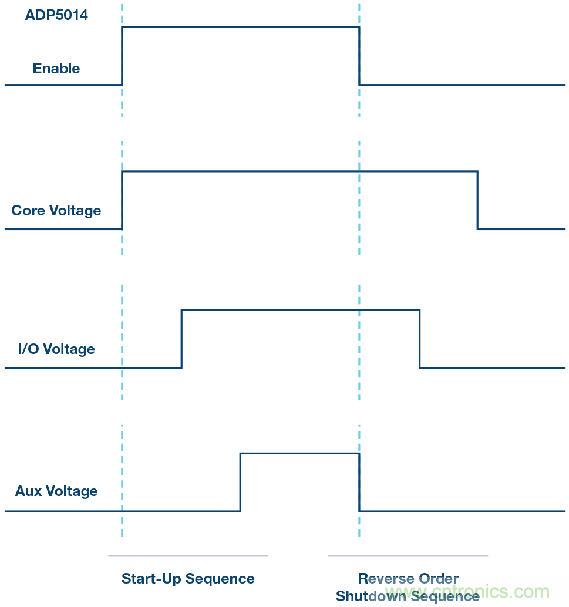 圖2. ADP5014 PMIC集成了對靈活控制上電/關斷時序的支持。