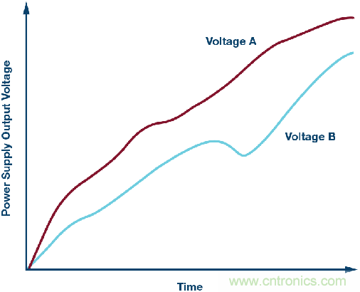 除了電壓時序之外,啟動過程中還可能要求電壓單調上升。這意味著電壓僅線性上升,如圖4中的電壓A所示。此圖中的電壓B是電壓非單調上升的例子。在啟動過程中,當電壓上升到一定電平時負載開始拉大電流,就會發生這種情況。防止這種情況的一種辦法是延長電源的軟啟動時間,并選擇能夠快速提供大量電流的電源轉換器。