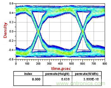 同樣的位置,與圖3相比可以看出增大耦合電容后,眼高變低。原因是“高速”使電容變的不理想。感應電感會產生串聯諧振,容值越大,諧振頻率越低,AC耦合電容在低頻情況下呈感性,因此高頻分量衰減增大,眼高變小,上升沿變緩,相應的JITTER也會增大。通常建議AC耦合電容在0.01uf~0.2uf之間,項目中0.1uf比較常見。推薦使用0402的封裝。