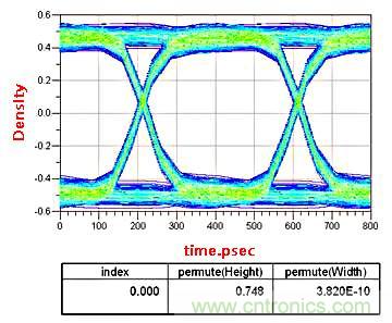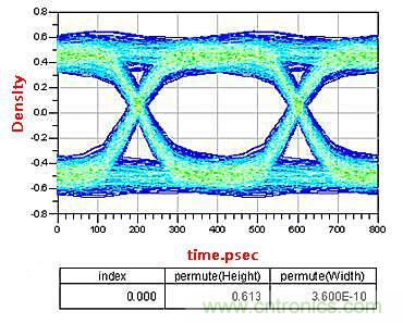 在低速電路設計中,這顆電容可以等效成理想電容。而在高頻電路中,由于寄生電感的存在以及板材造成的阻抗不連續性,實際上這顆電容不能看作是理想電容。這里信號頻率2.5G,通道長度4000mil,AC耦合電容的位置分別在距離發送端和接收端200mil的位置。我們看一下仿真出的眼圖的變化。