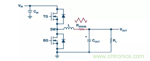對于降壓調節器,電流檢測電阻有多個位置可以放置。當放置在頂部MOSFET的高端時(如圖3所示),它會在頂部MOSFET 導通時檢測峰值電感電流,從而可用于峰值電流模式控制電源。但是,當頂部MOSFET關斷且底部MOSFET導通時,它不測量電感電流。