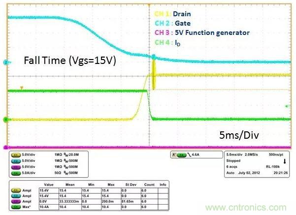 在電池保持板PCM過流關斷的過程中,從波形可以看到:功率MOSFET同樣也有較長的一段時間工作于線性區。