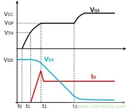 階段3(t2-t3)為米勒平臺,VGS電壓保持米勒平臺電壓VGP,整個過程中,VDS電壓逐漸下降到低的電壓值,ID電流保持不變。