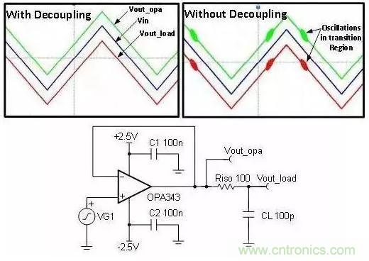 要回答這個問題,需要考證在不使用去耦器件時會出現什么問題。 圖 1 為帶去耦電容器和不帶去耦電容器(C1 和C2)情況下用于驅動 R-C 負載的緩沖電路。我們注意到,在不使用去耦電容器的情況下,電路的輸出信號包含高頻 (3.8MHz) 振蕩。對于沒有去耦電容器的放大器而言,通常會出現穩定性低、瞬態響應差、啟動出現故障以及其它多種異常問題。
