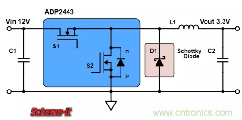 下圖是一個典型的降壓同步開關(guān)穩(wěn)壓電路(查看Scheme-it原理圖),其使用ADI ADP2443為同步開關(guān)穩(wěn)壓芯片。采用N溝道MOSFET和額外的肖特基二極管,可最大限度地減少干擾。