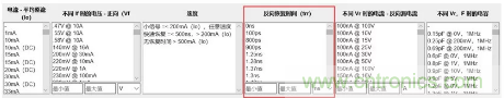 Digi-Key官網(wǎng)上,肖特基二極管選型列表中,提供“反向恢復(fù)時間”欄。為了減少額外的電磁干擾,反向恢復(fù)時間越小越好。