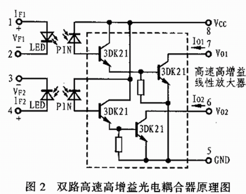 近幾年來,國內(nèi)有關(guān)單位投入大量人力物力也研究和開發(fā)了各種光電耦合器件。如上海半導體器件八廠、上海無線電十七廠等。而重慶光電技術(shù)研究所為了適應(yīng)市場需要研制出了一種由高速響應(yīng)發(fā)光器件和邏輯輸出型光接收放大器組成的厚膜集成雙路高速高增益電耦合器。這種光電耦合器的輸入端由兩只GaAIAs側(cè)面發(fā)光管組成,其輸出端由兩只Si—PIN光電探測器以及兩個高速高增益線性放大電路組成。圖2所示為其原理電路圖,除此之外,重慶光電技術(shù)研究所還研制出了高速高壓光電耦合器、GG2150I型射頻信號光電耦合器、GG2060I型高壓脈沖測量光電耦合器、GH1204U型高壓光傳輸光電耦合器以及 GH1201Y型和GOHQ-I型光電耦合器等。
