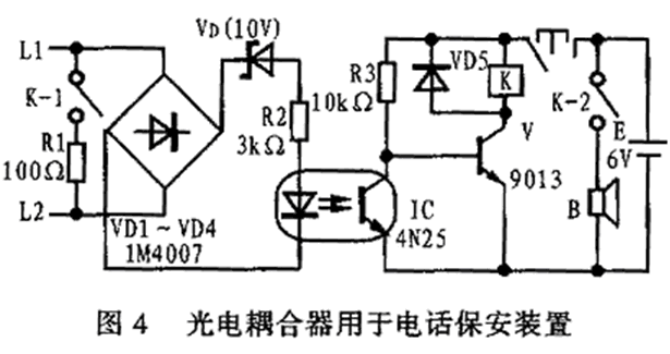 為了防止電話線路被并機竊用或電話機被盜用通話,可以利用光電耦合器來設(shè)計一個簡單實用的電話保安電路,其實隔電路如圖4所示。圖中,由VD1~VD4組成極性轉(zhuǎn)換電路。由于在將本保安器接入電話線路中時,不需要分清電話線路反饋電壓的極性,因此,使用該保安器可以給安裝帶來很大的方便。