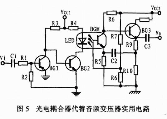 目前,利用光電耦合器代替音頻變壓器的應(yīng)用電路有多種形式,圖5所示是比較實用的一種。當輸入信號Vi經(jīng)三極管BG1、BG2前級放大之后,驅(qū)動光電耦合器左邊的LED發(fā)光,并被右邊的光敏管全部吸收并轉(zhuǎn)換成電信號,此信號經(jīng)后級電路BG3放大,并由該管的發(fā)射極通過電容器C3后輸出一個不失真的放大信號 V0。由于該電路將前后兩級放大器之間完全隔離,因而杜絕了地環(huán)路可能引起的干擾。同時由于該電路還具有消噪功能,因此避免了信號的失真。整個電路的總增益可望達到20dB以上,帶寬約120kHz。