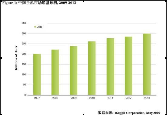 預(yù)計中國手機市場2009年的銷量為兩億三千八百萬臺,較去年成長7.8%。然而受經(jīng)濟危機的影響,全球手機的出貨量將呈現(xiàn)負(fù)增長,出貨量為11億部手機。附圖為中國手機市場銷量預(yù)測, 2009-2013