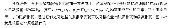 因此,(2-81)、(2-82)、(2-83)、(2-84)式最好只用于對正激式輸出的單激式開關電源變壓器進行磁滯損耗和渦流損耗功率測試,因為其初級線圈的電感相對比較大,勵磁電流比較小;如果需要對反激式輸出的單激式開關電源變壓器進行測試,最好只用于對小功率開關電源進行對比測試。