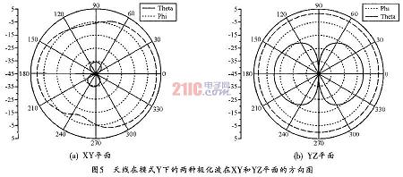 從圖3可以看出,射頻電流主要集中在天線水平方向的微帶線上(這印證了前面的分析)。但同時,在中間部分的微帶以及天線其他部分也存在射頻電流,因此,天線仍會輻射部分垂直極化波。圖4所示為天線的兩種極化波在XY及YZ平面的方向圖。