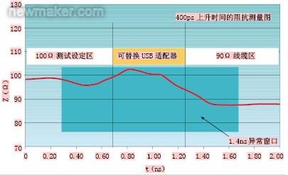 傳播通路中阻抗不連續(xù)性將會導(dǎo)致反射損失和信號失真。借助時域反射計(TDR),阻抗值可用時間函數(shù)直接顯示出來(見圖2),以便時刻監(jiān)測該數(shù)值是否符合USB系統(tǒng)的規(guī)定系統(tǒng)公差。