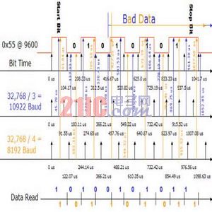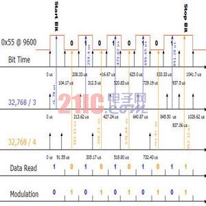 UART數(shù)據(jù)用10,922波特或8,192波特的UART接收。由于UART在傳輸中間點(diǎn)對數(shù)據(jù)進(jìn)行采樣以補(bǔ)償抖動,因此該點(diǎn)已經(jīng)被選擇為接收UART的采樣點(diǎn)。在沒有行抖動的理想情況下,10,922波特UART對第三數(shù)據(jù)位的開始兩次讀數(shù)都會是錯誤的而8,192波特的UART由于會完全遺漏第三位,很快就將出錯。由于低功耗應(yīng)用的理想時鐘是低功耗實(shí)時時鐘模式,這使得在低功耗環(huán)境中處理很困難。解決這一問題的最好辦法就是將µC與調(diào)制技術(shù)結(jié)合使用,用32kHz振蕩器提供非常精確的2,400波特,并完全能支持9,600波特(參見圖3)。