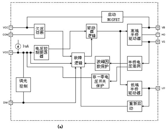 IRS2530D和IRS2158D為600V控制IC。IRS2530DDIM8是一種采用緊湊型8管腳尺寸半橋式驅(qū)動器的線性調(diào)光鎮(zhèn)流器控制IC。它只需要幾個小型外部元件,顯著地簡化和縮小了電路設(shè)計,同時可實現(xiàn)10%的調(diào)光系統(tǒng)性能。圖3(a)為引腳功能示意圖。[page]