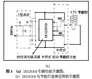 從圖3(a)可知,IRS2530D為8引腳控制IC,采用IR的專利鎮(zhèn)流器和高壓技術(shù)。一個高壓管腳可檢測半橋電流和電壓,以實現(xiàn)必要的鎮(zhèn)流器保護(hù)功能;DC調(diào)光輸入電壓基準(zhǔn)與AC燈電流反饋相結(jié)合,可以實現(xiàn)單管腳調(diào)光;IRS2530D還具有內(nèi)部非零電壓切換保護(hù)和內(nèi)部振幅因數(shù)保護(hù),防止燈泡故障損壞鎮(zhèn)流器。圖3(b)為IRS2530D與節(jié)能燈連接應(yīng)用的示意圖。