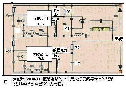 圖4為應(yīng)用VK06TL驅(qū)動電路的一個熒光燈慎流器專用的驅(qū)動器,即半橋變換器設(shè)計方案圖。