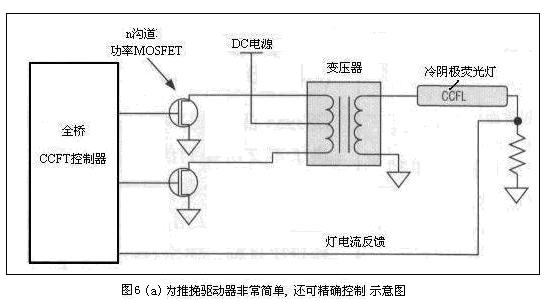 之所以考慮推挽驅(qū)動器,因它有很多好處。這種架構(gòu)只用到n溝道MOSFET(見圖6(a)所示),這有利于降低成本和增加逆變器效率。它很容易適應(yīng)較高的逆變器直流電源電壓。采用更高的逆變器直流電源電壓時,只需選擇具有合適的漏-源擊穿電壓的MOSFET即可。不管逆變器的直流電源電壓如何,都可采用同樣的CCFL控制器。但采用n溝道MOSFET的全橋和半橋架構(gòu)就無法做到這一點。對于LCD電視非常理想,因為電視中的逆變器直流電源電壓通常會被穩(wěn)定在±20%。