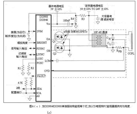 圖6(c)為用DS3984(4通道)和DS3988(8通道)CCFL控制器既解決了本文所提到的所有這些設(shè)計挑戰(zhàn)。可將這些器件配置為每個通道驅(qū)動一個燈,或者每通道多個燈,用戶可靈活裁減設(shè)計,以滿足自己的性價比目標(biāo)。多個DS3984/DS3988可輕松級聯(lián),以支持任意數(shù)量的燈,來為LCD電視屏提供背光照明。