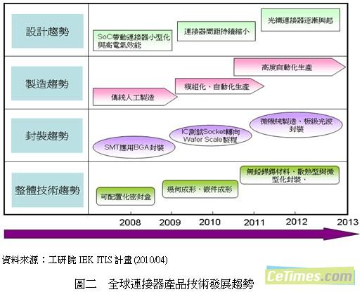金融風暴過后,連接器產品技術革新仍持續推進,以下將由設計、制造、封裝/組裝三大構面探討連接器技術層面的發展趨勢(見圖二):