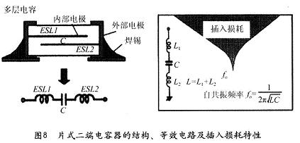 從圖6中可見,電容器的插入損耗一開始隨頻率增加而增加,直至達到自諧振頻率(等效電感與電容的串聯諧振),插入損耗也達到最大值。此后,由于等效電感的感抗增大,使插入損耗開始下降。