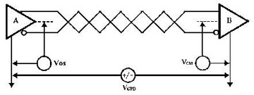 • 共模干擾問題。的確,RS-485接口采用差分方式傳輸信號,并不需要相對于某個參照點來檢測信號,系統只需檢測兩線之間的電位差就可以了。但應該注意的是,收發器只有在共模電壓不超出一定范圍(-7V至+12V)的條件下才能正常工作。當共模電壓超出此范圍就會影響通信的可靠,直至損壞接口。如圖3所示,當發送器A向接收器B發送數據時,發送器A的輸出共模電壓為VOS,由于兩個系統具有各自獨立的接地系統,存在著地電位差VGPD。那么,接收器輸入端的共模電壓就會達到VCM=VOS+VGPD。RS-485標準規定VOS≤3V,但VGPD可能會有很大幅度(十幾伏甚至數十伏),并可能伴有強干擾信號,致使接收器共模輸入VCM超出正常范圍,并在信號線上產生干擾電流,輕則影響正常通信,重則損壞接口。