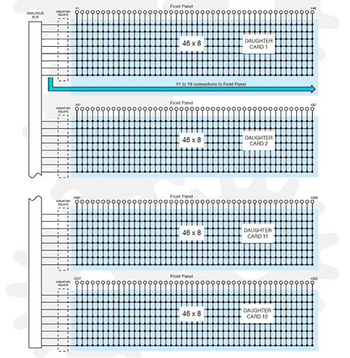 主子板卡決定了Y軸的尺寸,而其他子板卡只是擴展了X軸上的點數。每個子板卡在Y軸尺寸上必須和主子板卡相同,根據不同版本的BRIC選擇其他不同的子板卡。BRIC在Y軸尺寸上有4,8,16這幾種標準尺寸,要想獲得其他的尺寸就需要減少板卡上的繼電器數量即可。除了一個柱上開關外,可以提供的還有屏蔽的和2個柱上開關的矩陣形式。