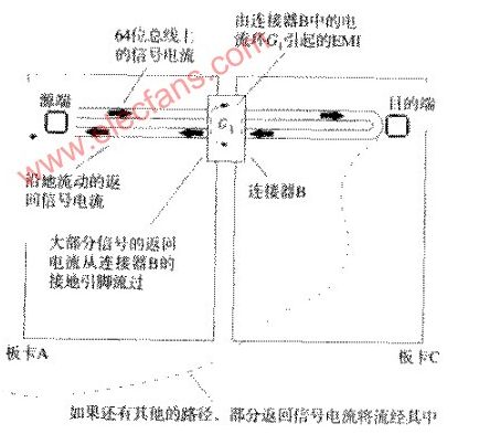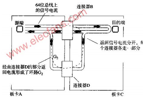 一個(gè)64位總線(xiàn)從板卡A經(jīng)過(guò)連接器B連到母板卡上,母板卡可能是一個(gè)主CPU卡或是一個(gè)通往其他子卡的無(wú)源通道。64條信號(hào)線(xiàn)的返回電流從母板卡C流回板卡A,其中的絕大部分通過(guò)了連接器B的接地腳。