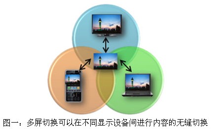 目前我國的三網融合進程正在加速。三網融合帶給用戶最大的體驗就是多屏幕的融合,同樣的服務可以由不同的終端設備實現,而不同的設備也可以訪問相同的資源。在三網融合的大背景下,多屏切換的概念也應運而生。多屏切換在多屏幕融合基礎上,向用戶提供了多個顯示終端的跨屏交互服務,用戶的使用內容可以在不同顯示終端的屏幕上進行無縫連接。舉例來說,對于同樣的一段視頻,用戶在戶外可以用手機觀看一部分,在辦公場所可以用PC接續觀看,而回到家中則可以繼續用電視觀看剩余的部分。對于其他的應用,如游戲、音樂等,多屏切換也允許進行類似的操作。從數字電視的角度來看,多屏切換對數字電視有極大的推動作用。數字電視做為最傳統也是顯示面積最具優勢的設備,可以提供不同于手機和PC的體驗。