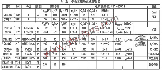 從附表中可以了解到幾種頗具代表性的MOS管的主要特性數據。現以日立公司的老牌LDMOS管K135/J50為例加以說明。K135/J50的柵一源開啟電壓閾值為一0.15~一1.45V。實測當Io=10mA時VO.25V,而當I~=100mA典型值時V增加到0,6~0、85V。可見場效應管的壓控特性決定了柵一源損耗電壓是隨漏極電流I增大而上升的(相對于這一點,雙極晶體管的V幾乎恒為0.7V)。MOS管的內部損耗主要取決于漏源導通電阻R、的大小。K135/J50的參數中沒有直接給出RDs1這一項,但是通過漏源導通電壓VDs(sat):12V和ID7A兩個數據,利用公式RDs(oN)=UDs)/ID可計算出K135/J50的R、約為1.7Q。這相當于把一個1.7Q的電阻與負載串聯,對于標準的8Q負載而言其損失的功率已接近20%。