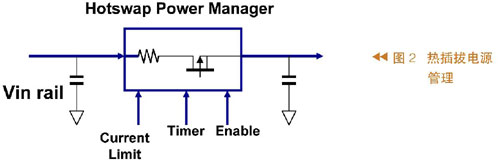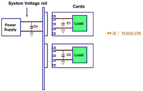 圖1所示為熱插拔過程,其中左邊代表系統及其供電,在供電的輸出端有一個電容,右側有兩張卡,這些卡的輸入端也有電容。把卡插入系統之前,輸入電容沒有被充電;當把卡插入系統時會有一個很大的瞬間電流向輸入電容充電,這么大的瞬時電流很可能造成系統供電電壓不正常。