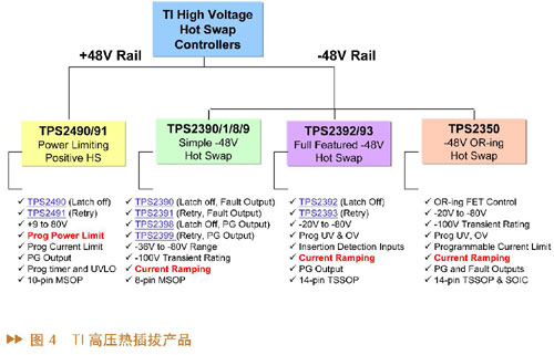 TI推出了很多熱插拔產品,并且多個產品中加入了特殊功能以提升熱插拔的工作功率,這能夠使熱插拔MOS管工作在安全區,從而提高產品可靠度、降低成本。另外一個功能就是di/dt(電流上升的速率),這能夠減少噪音和對電路零件的沖擊。TI的熱插拔產品主要分為兩類:高壓熱插拔產品,針對48V、-48V或24V應用;低壓熱插拔產品,針對3V到15V的應用。