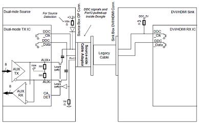 對于一個雙模源端設備而言,監視接口13管腳上的電壓值是可選的。通常情況下,雙模源端設備會先嘗試進行AUXCH讀操作。如果讀操作失敗,該雙模源端設備會進行DDC讀寫操作,用于檢測適配器是否連接。