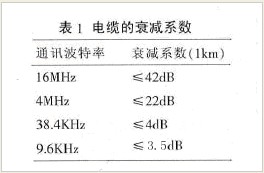 導線的電阻對信號的影響很小,可以忽略不計。電纜的分布電容C主要是由雙絞線的兩條平行導線產生。信號的損失主要是由于電纜的分布電容和分布電感組成的LC低通濾波器。通訊波特率越高,信號衰減也會越大。常規電纜的衰減系數見表1.