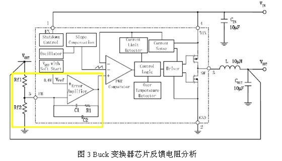 Buck變換器由于具有效率高的優點而被廣泛應用于手機、GPS、MP3等移動多媒體設備上,目前很多電源管理芯片制造廠商都推出了不同電流能力的Buck變換器,這類變 換器雖然在電流能力和保護功能方面存在一些差異,但是他們電路的主框架結構是基本一致的,主要可以分為兩個部分:一是實現電能轉換的主功率部分,另一部分 是實現負反饋控制的控制電路。下圖是BCD半導體公司的Buck變換器AP3406的典型應用圖,黃色框里是對反饋電阻的作用做簡要分析。