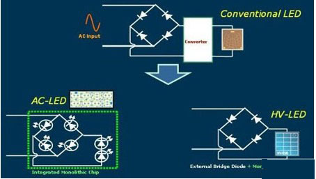 此外,高壓發光二極體在應用上和一般低壓二極體最主要的不同點為,它不僅僅能夠應用于定直流(Constant DC)中,只要外接橋式整流器,它也能夠應用于交流環境,非常具有彈性。在高壓發光二極體中,外部整流器捨棄AC LED採用同質氮化鎵的做法而改採用硅整流器,不僅使得耗能少,更可防止逆向偏壓過大對晶片所造成的影響;最后,因為高壓發光二極體較AC LED少了內部橋整的發光區,使發光效率相對較高,耐用度也較佳。