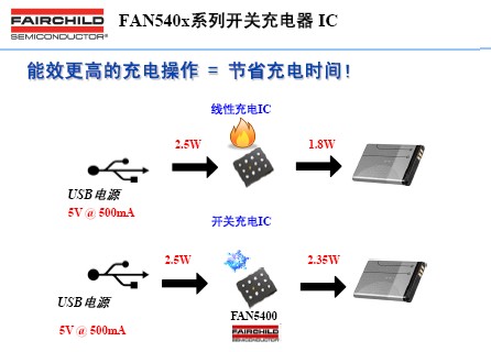 FAN5400系列電池充電器IC使用高集成度開關(guān)模式充電器,以便最大限度地縮短從USB電源為單節(jié)鋰離子(Li-Ion)電池充電的時(shí)間,并使用升壓調(diào)節(jié)器從電池為USB外設(shè)供電。由于充電電流和電池容量繼續(xù)增加,使用線性充電器通過USB端口或5V AC/DC適配器進(jìn)行充電的效率變得越來越低,F(xiàn)AN5400的開關(guān)模式充電器能夠提供高達(dá)94%的效率,有助于加快充電速度并減少熱耗散。