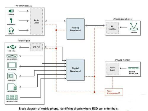 由于手機的設計對象是大眾消費者,而且可在任何環境中使用,因此ESD很有可能會進入其中的一個端口或I/O接口,并導致芯片組出現電氣不穩定現象或完全損壞。圖2用于幫助說明不同電路該用什么樣的ESD保護技術。它表明,所有的電路都有可能為ESD進入手機提供一個途徑。