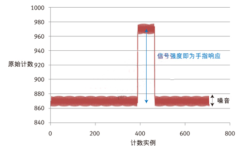 圖5:原始傳感器數(shù)據(jù)由手指響應(yīng)和噪音構(gòu)成。手指響應(yīng),也稱為信號強(qiáng)度,是當(dāng)手指放在傳感器上時(shí)通過感應(yīng)系統(tǒng)可以看到的原始計(jì)數(shù)的差別