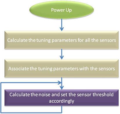 噪聲是一個(gè)隨機(jī)時(shí)間函數(shù),由其自身性質(zhì)決定。工作一個(gè)小時(shí)后和剛開機(jī)時(shí)是不一樣的,下一個(gè)時(shí)刻又不相同。因此,手指檢測的閾值應(yīng)基于傳感器原始計(jì)數(shù)檢測到的噪聲來調(diào)整。圖8顯示了自調(diào)試系統(tǒng)如何基于系統(tǒng)噪聲調(diào)整手指閾值。
